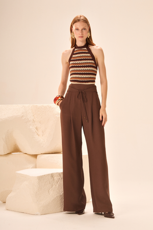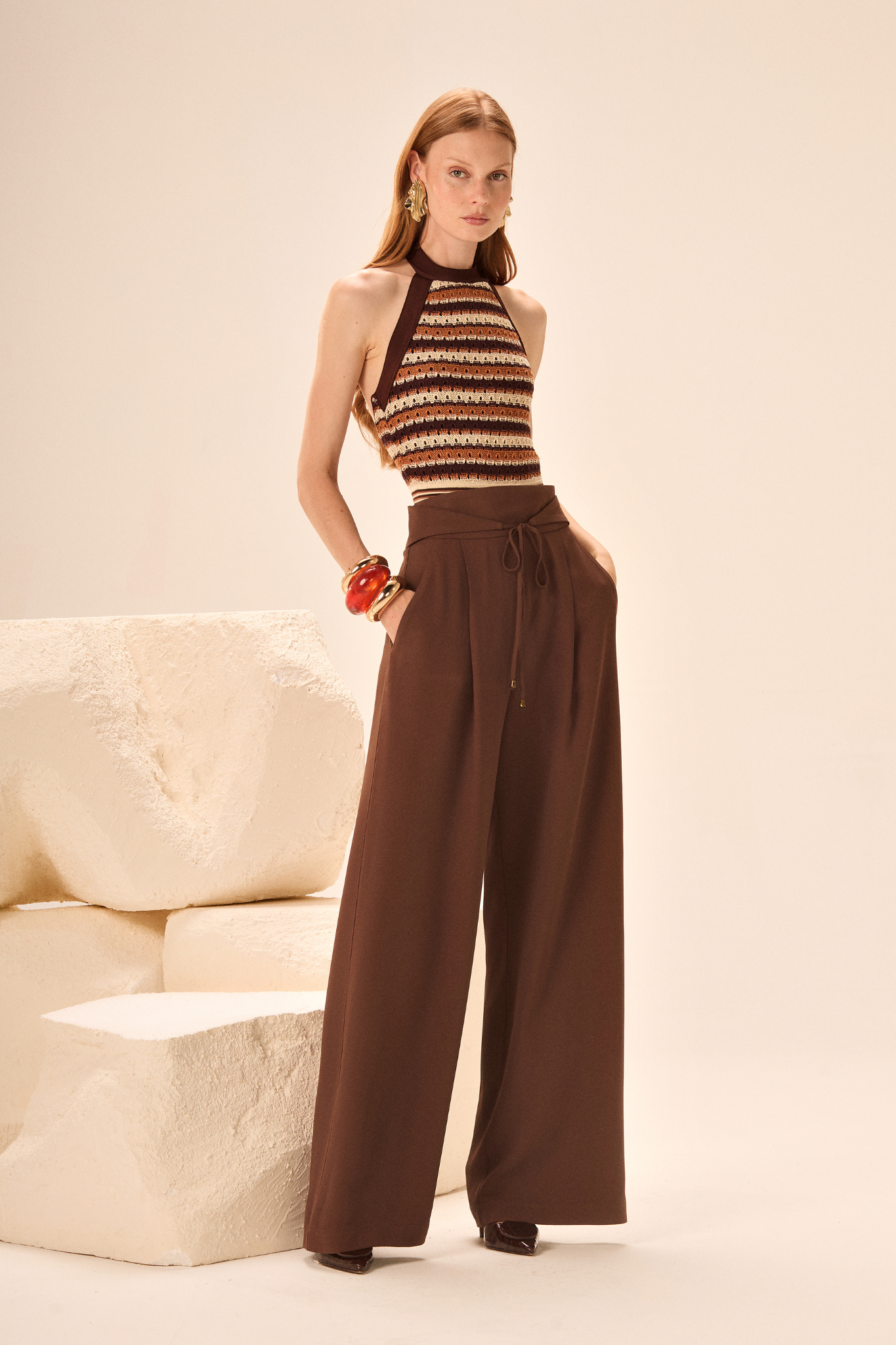 Calça Helena de alfaiataria confeccionada em Crepe Patou. Modelagem com cintura alta e pala estruturada que valoriza a silhueta. Possui amarração frontal com ponteiras delicadas e caimento fluido, proporcionando elegância e conforto.