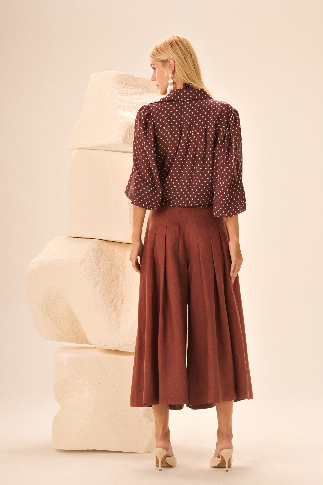 Conjunto de camisa com estampa de poás e top coordenado. Peças confeccionadas em crepe georgete estampado. Camisa possui modelagem com mangas bufantes e punhos largos. A combinação une modernidade e feminilidade em um look sofisticado e cheio de estilo.