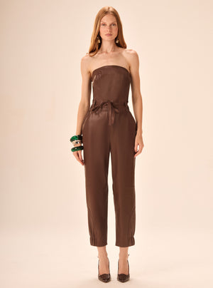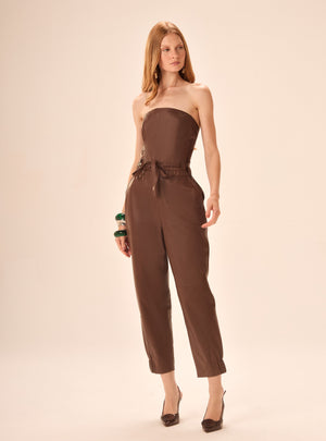Macacão em couro 100% natural premium com modelagem tomara que caia. Possui ajuste na cintura com laço e elástico nas costas.