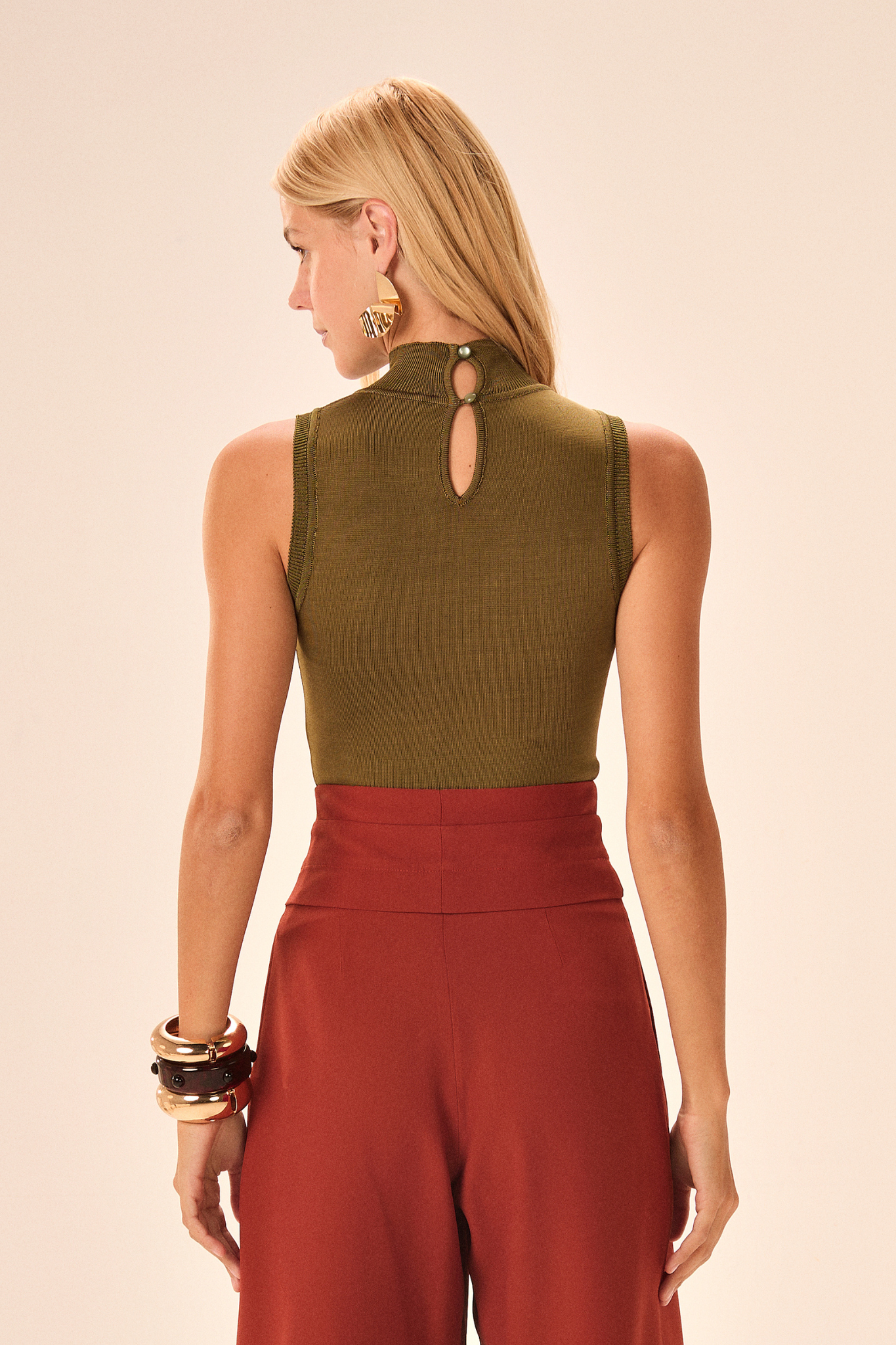 Regata em tricot com fio Rayon, de toque suave e caimento impecável. Com gola alta e modelagem ajustada ao corpo, valoriza a silhueta e garante conforto com estilo. Uma peça versátil e atemporal, perfeita para compor produções casuais ou sofisticadas. Peça possui fechamento nas costas com botão.